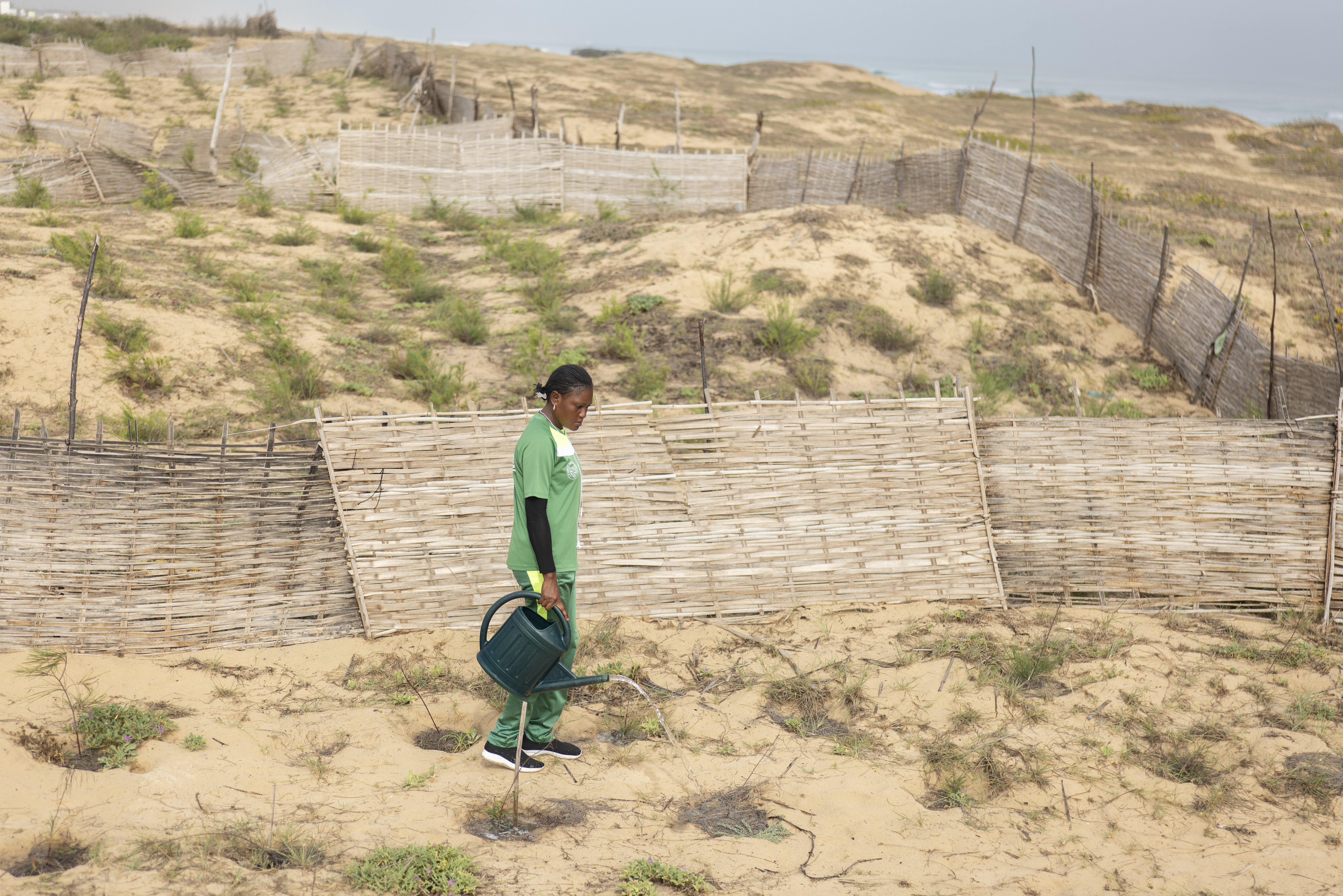 José Naranjo/Senegal. Louise Anne Marie Gomis, de 28 años, acarrea agua en cubos y la vierte sobre los brotes verdes que surgen entre las dunas. “Es importante regar, sobre todo en la estación seca, estas plantas nos protegen del avance del mar e impiden que la arena invada la carretera y nuestras casas”, asegura con orgullo. Pese a que nació aquí al lado, en Yembeul, y está acostumbrada a ver desde pequeña este particular ecosistema, nunca le habían explicado la importancia que tiene. Hoy, esta joven forma parte del equipo de voluntarios encargado de reforestar el lugar, una pieza más de un titánico empeño que dura décadas y al que se ha sumado el Pacto de los Alcaldes en África Subsahariana (CoM SSA, por sus siglas en francés), con el apoyo y financiación de la Unión Europea.