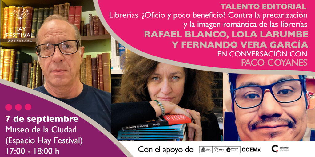 Librerías. ¿Oficio y poco beneficio? Contra la precarización y la imagen romántica de las librerías. Rafael Blanco, Lola Larumbe y Fernando Vera García en conversación con Paco Goyanes | 7 de septiembre / 17:00 - 18:00 h Museo de la Ciudad (Espacio Hay Festival)